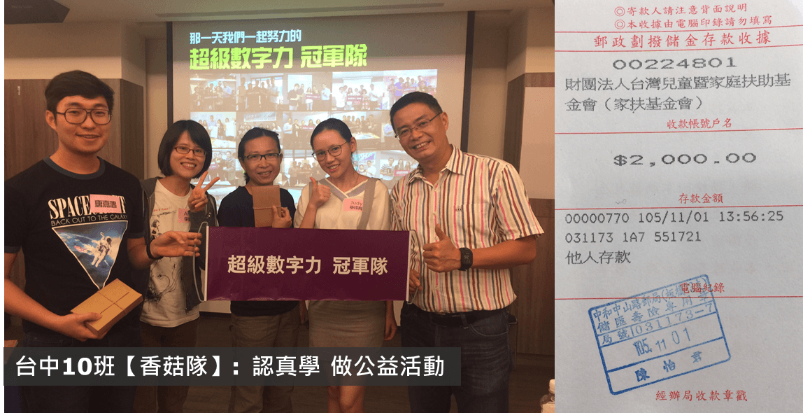 課程中小組得分,每 10 萬分由講師MJ捐款 $ 200 元給冠軍隊小組長決定之弱勢團體。