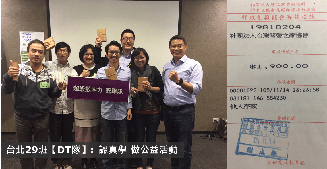 本次台北29班冠軍隊 【DT隊】小組競賽總分94.5 萬分,愛心款項$1,900元,已捐給您指定的【台灣關愛之家】。