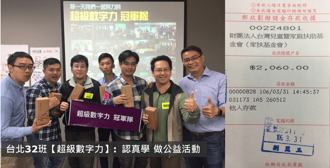 本次台北32班冠軍隊 【超級數字力】小組競賽總分103 萬分,愛心款項$2,060元,已捐給您指定的【家扶基金會】。