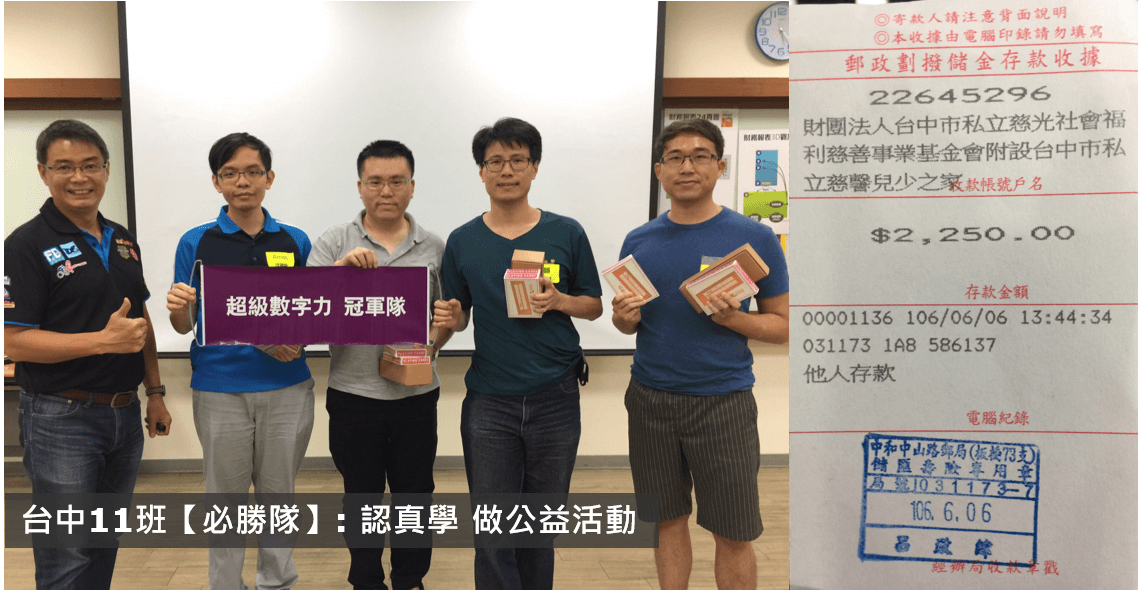 課程中小組得分,每10萬分由講師MJ捐款 $ 200 元給冠軍隊小組長決定之弱勢團體。