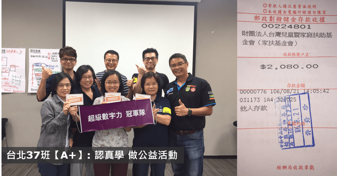 本次台北37班冠軍隊 【A+】小組競賽總分104 萬分,愛心款項$2,080元,已捐給您指定的【家扶基金會】。