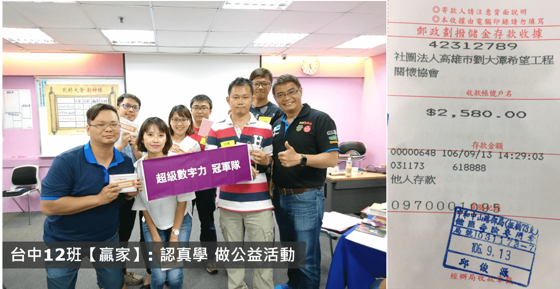 課程中小組得分,每10萬分由講師MJ捐款 $ 200 元給冠軍隊小組長決定之弱勢團體。
