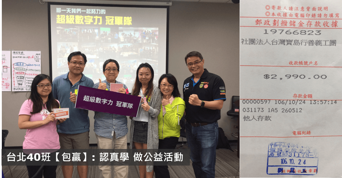 2017.10.20 台北40班 冠軍隊【包贏】獎金2,990元已捐出,感謝大家