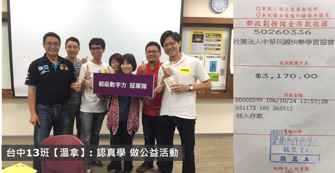 課程中小組得分,每10萬分由講師MJ捐款 $ 200 元給冠軍隊小組長決定之弱勢團體。