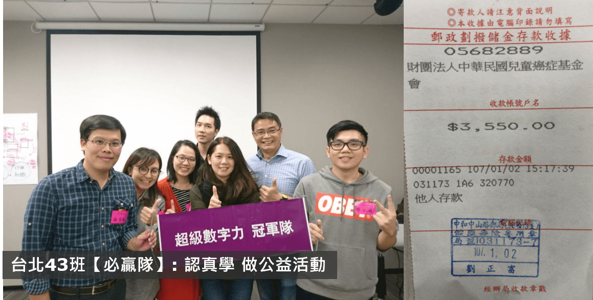 課程中小組得分,每10萬分由講師MJ捐款 $ 200 元給冠軍隊小組長決定之弱勢團體。