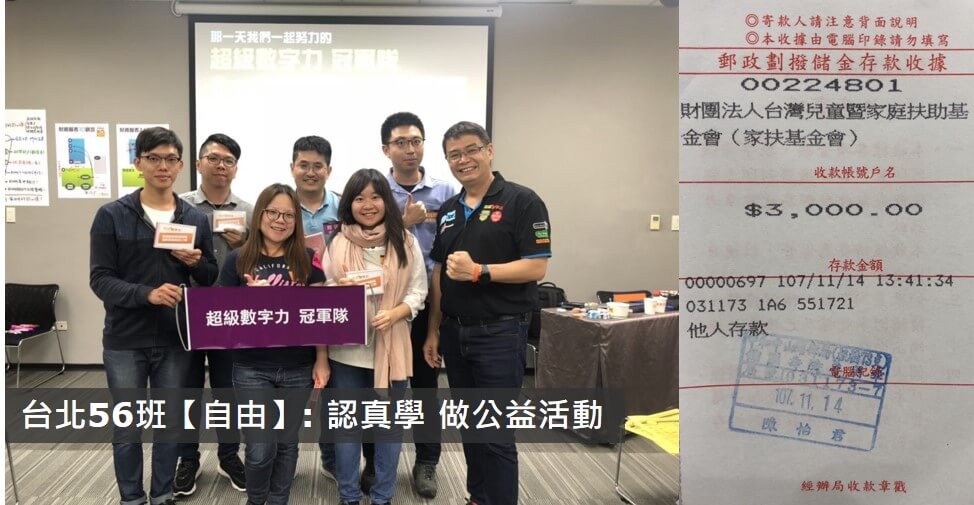 課程中小組得分,由講師MJ統一捐款 $ 3,000 元,由冠軍隊小組決定捐款的弱勢團體。