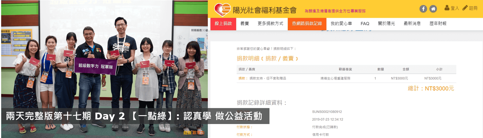 課程中小組得分,由講師MJ統一捐款 $ 3,000 元,由冠軍隊小組決定捐款的弱勢團體。