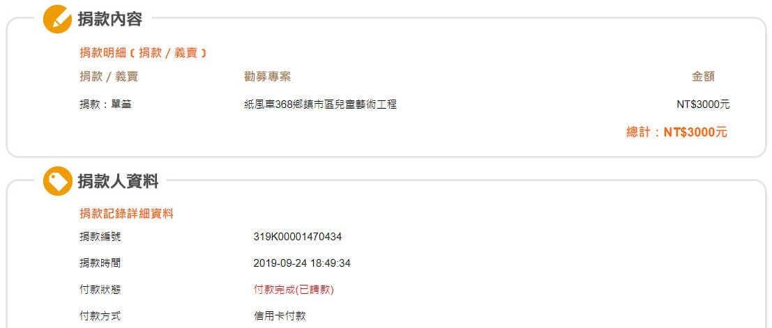 愛心款項$3,000元,已捐給您指定的【紙風車368鄉鎮市區兒童】。