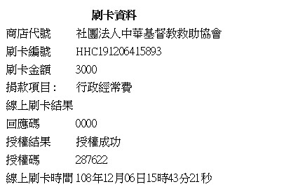 愛心款項$3,000元,已捐給您指定的【社團法人中華基督教救助協會】。