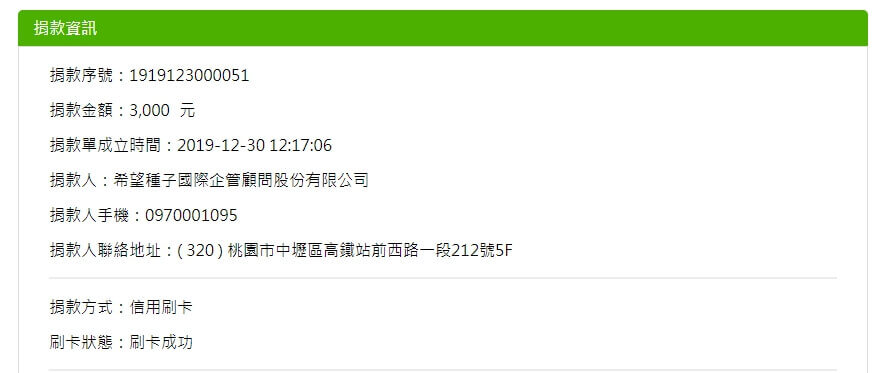 愛心款項$3,000元,已捐給您指定的【家扶基金會】。