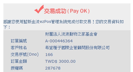 愛心款項$3,000元,已捐給您指定的【財團法人流浪動物之家基金會】。