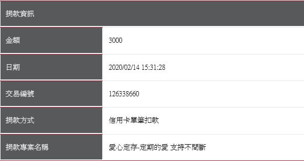 愛心款項$3,000元,已捐給您指定的【中華社會福利聯合勸募協會】。