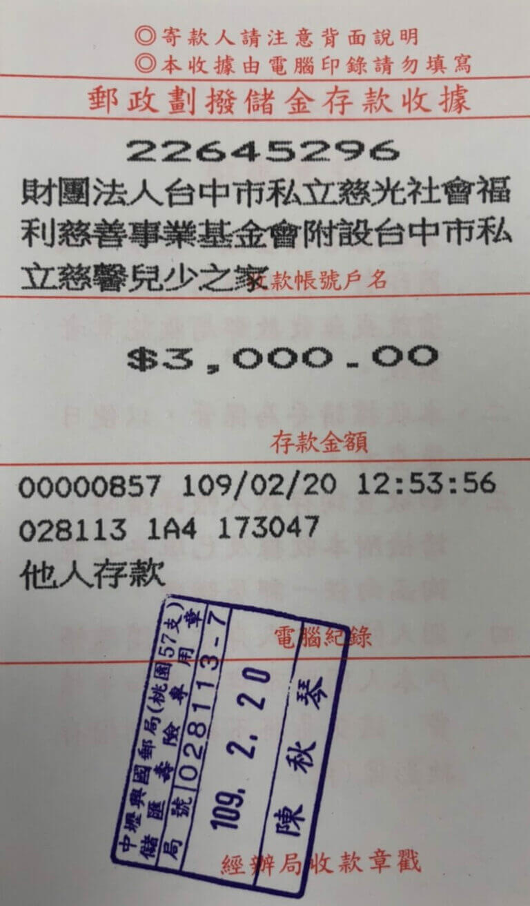 愛心款項$3,000元,已捐給您指定的【慈馨兒少之家】。