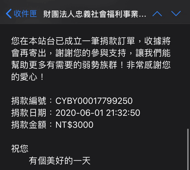 愛心款項$3,000元,已捐給您指定的【財團法人忠義社會福利事業基金會】。