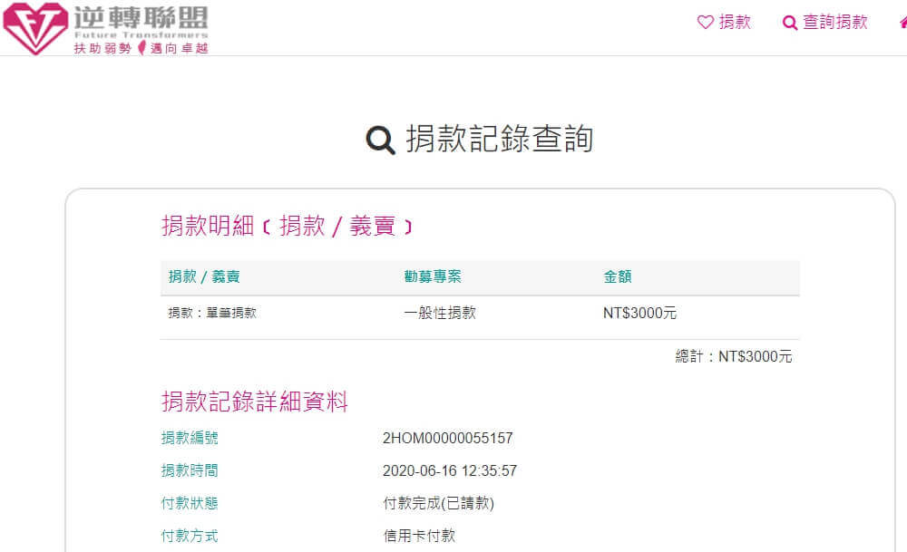 愛心款項$3,000元,已捐給您指定的【社團法人台灣逆轉聯盟協會】。