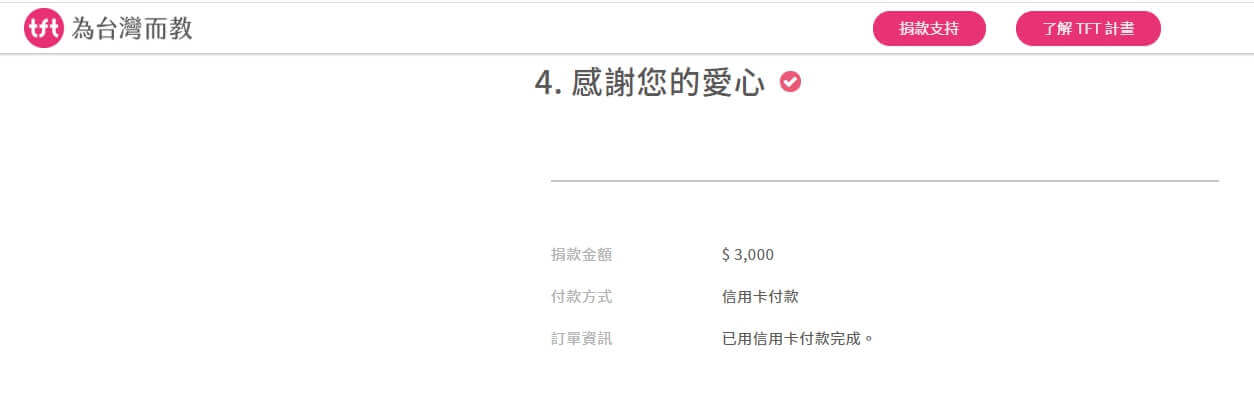 愛心款項$3,000元,已捐給您指定的【Teach For Taiwan為台灣而教】。