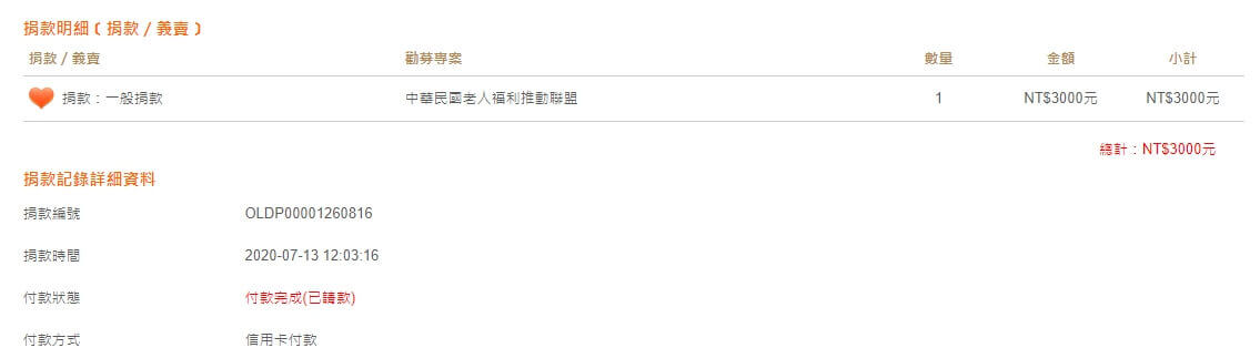 愛心款項$3,000元,已捐給您指定的【中華民國老人福利推動聯盟】。