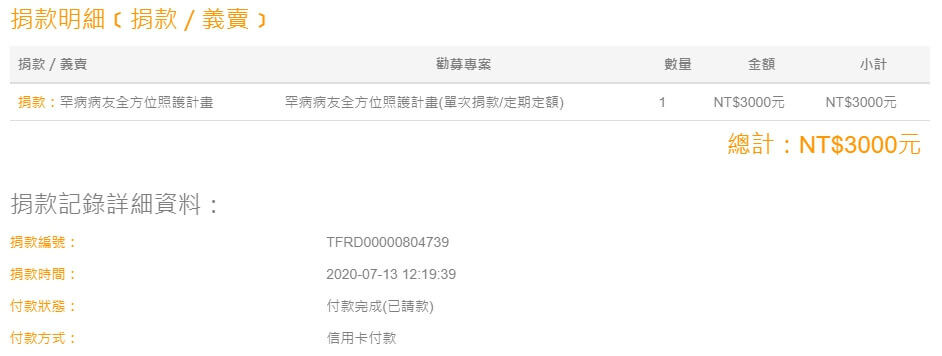 愛心款項$3,000元,已捐給您指定的【財團法人罕見疾病基金會】。