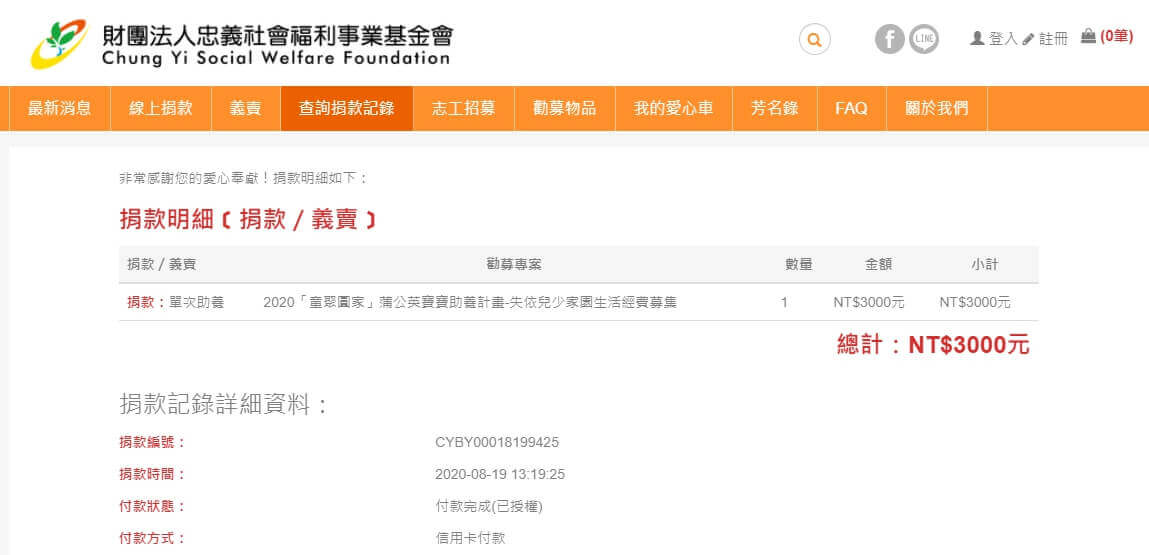 愛心款項$3,000元,已捐給您指定的【財團法人忠義社會福利事業基金會】。
