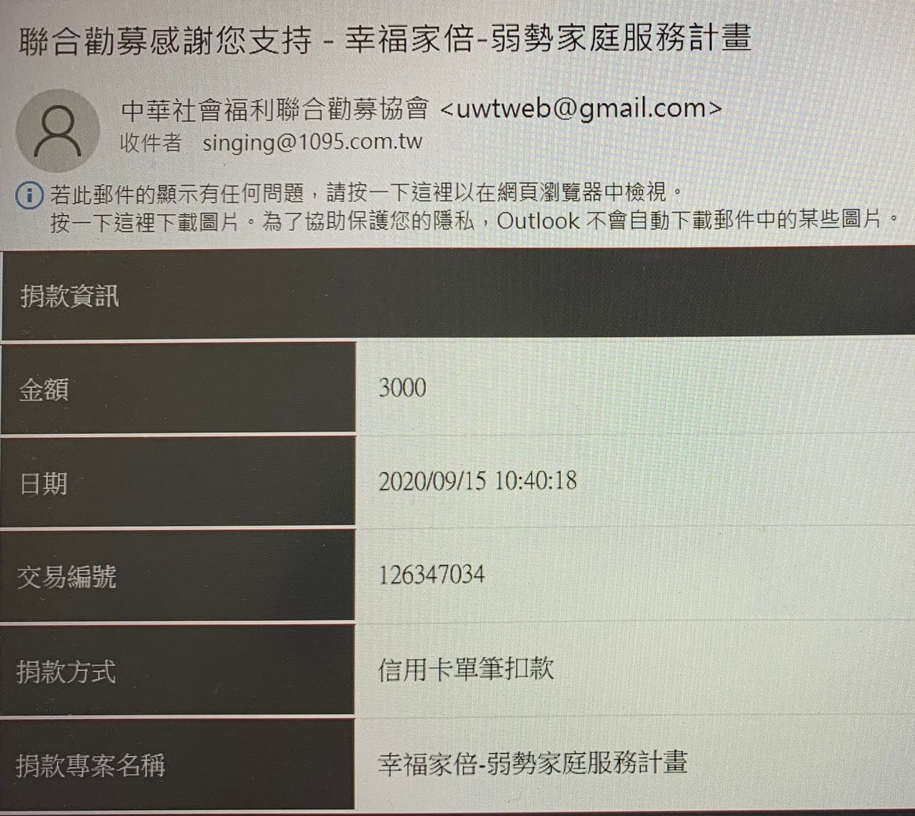 愛心款項$3,000元,已捐給您指定的【聯合勸募-幸福家倍-弱勢家庭服務計畫】