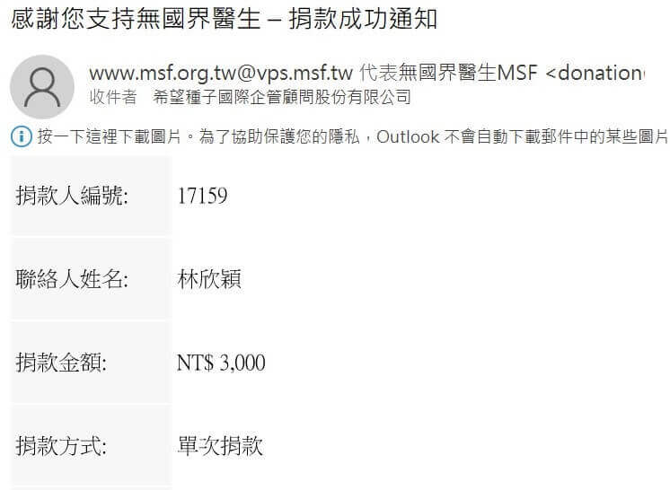 愛心款項$3,000元,已捐給您指定的【財團法人無國界醫生基金會】