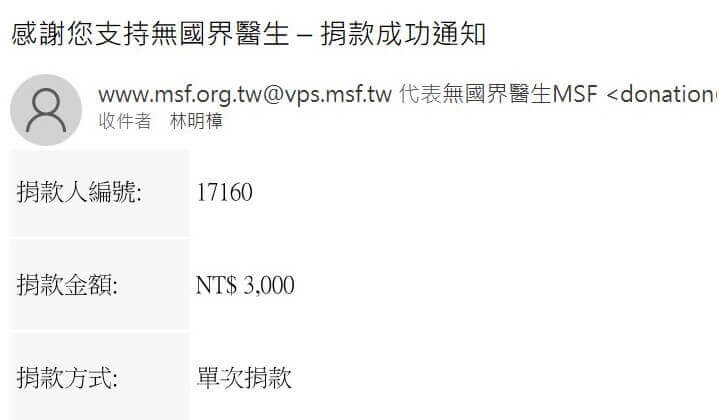 愛心款項$3,000元,已捐給您指定的【財團法人無國界醫生基金會】