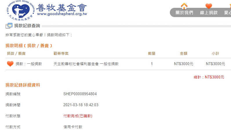 愛心款項$3,000元,已捐給您指定的【財團法人天主教善牧社會福利基金會】