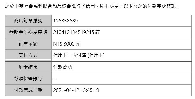 愛心款項$3,000元,已捐給您指定的【中華社會福利聯合勸募協會】