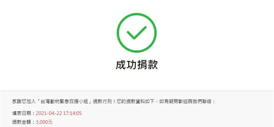 愛心款項$3,000元,已捐給您指定的【台灣動物緊急救援小組】