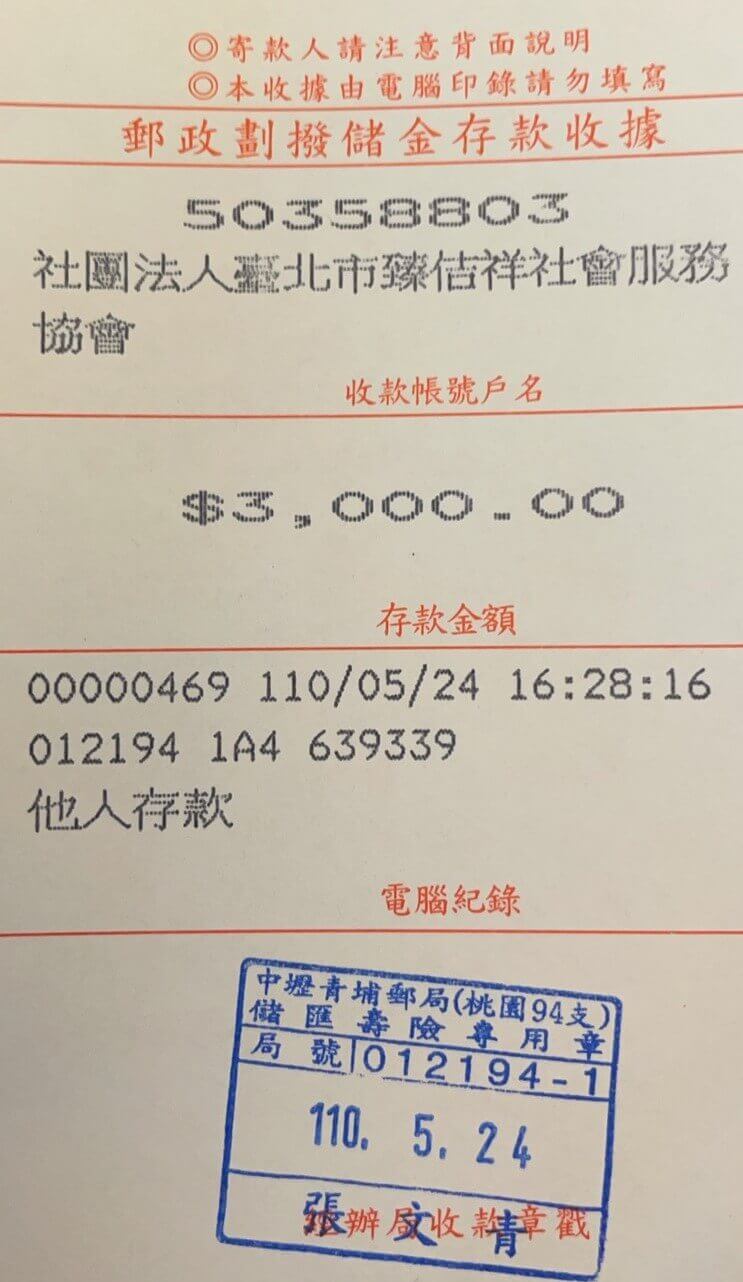 愛心款項$3,000元,已捐給您指定的【社團法人台北市臻佶祥社會服務協會】