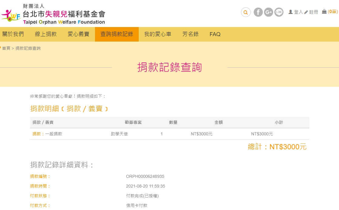 愛心款項$3,000元,已捐給您指定的【財團法人台北市失親兒福利基金會】