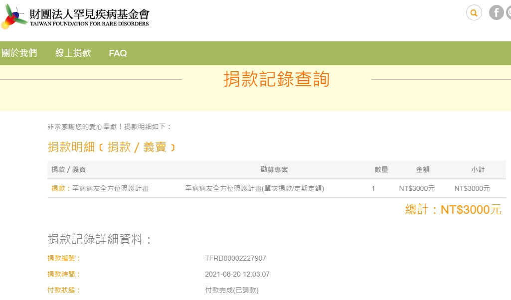 愛心款項$3,000元,已捐給您指定的【財團法人罕見疾病基金會】