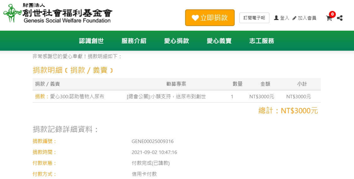 愛心款項$3,000元,已捐給您指定的【財團法人創世社會福利基金會】