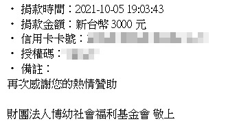 愛心款項$3,000元,已捐給您指定的【財團法人博幼社會福利基金會】