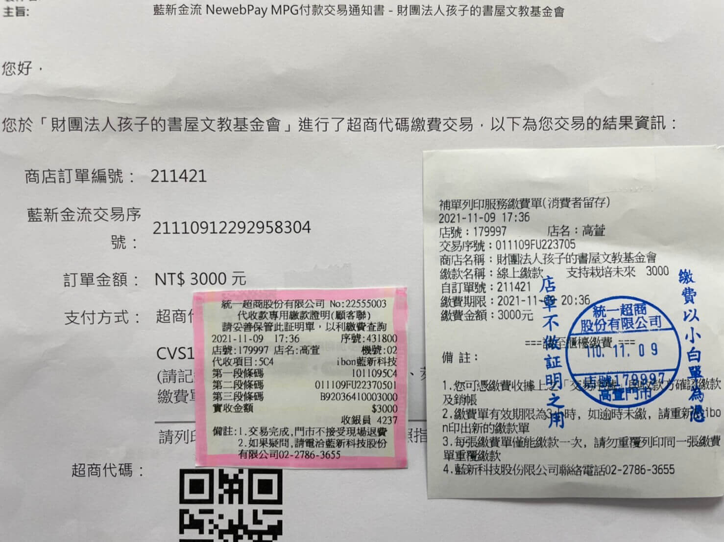 愛心款項$3,000元,已捐給您指定的【財團法人孩子的書屋文教基金會】