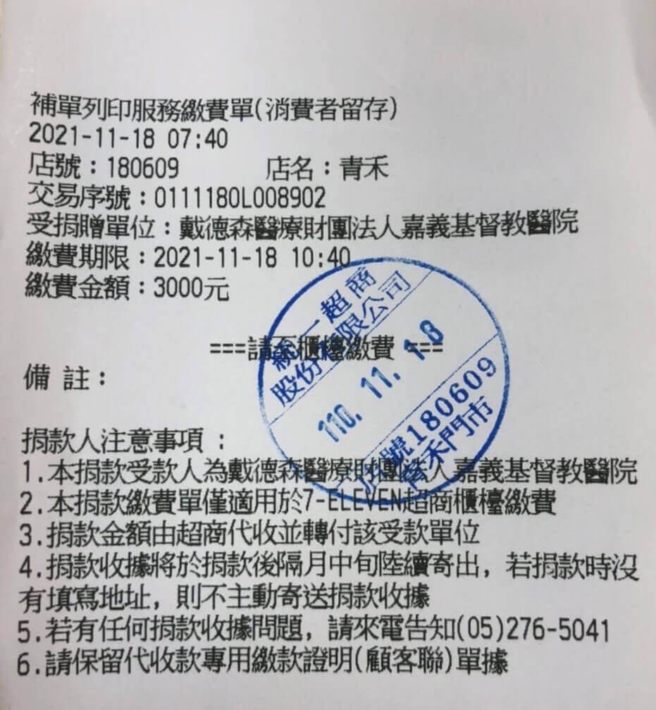 愛心款項$3,000元,已捐給您指定的【戴德森醫療財團法人嘉義基督教醫院】