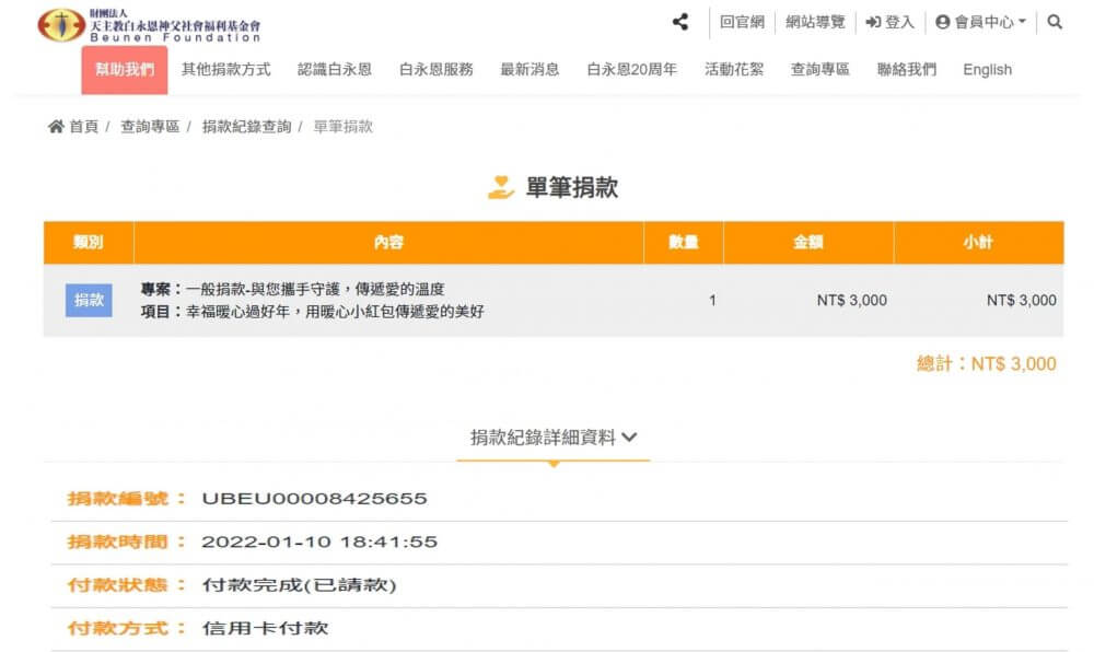 愛心款項$3,000元,已捐給您指定的【財團法人天主教白永恩神父社會福利基金會】