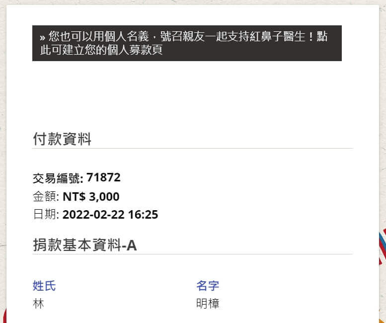 愛心款項$3,000元,已捐給您指定的【社團法人中華民國紅鼻子關懷小丑協會-紅鼻子醫生】