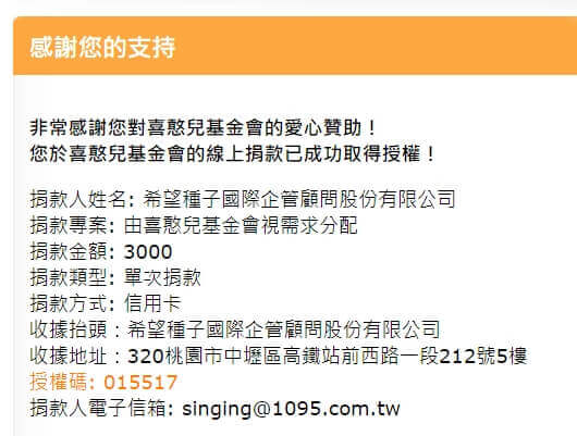 愛心款項$3,000元,已捐給您指定的【財團法人喜憨兒社會福利基金會】