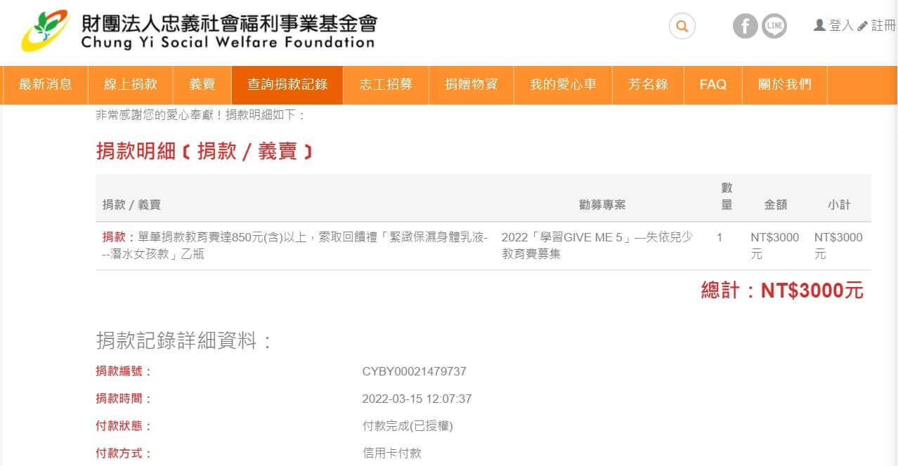 愛心款項$3,000元,已捐給您指定的【財團法人忠義社會福利事業基金會】