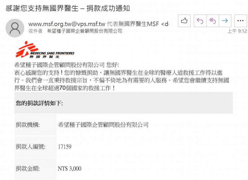 愛心款項$3,000元,已捐給您指定的【財團法人無國界醫生基金會】