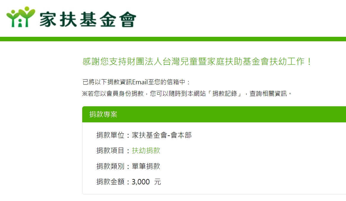 愛心款項$3,000元,已捐給您指定的【台灣兒童暨家庭扶助基金會】