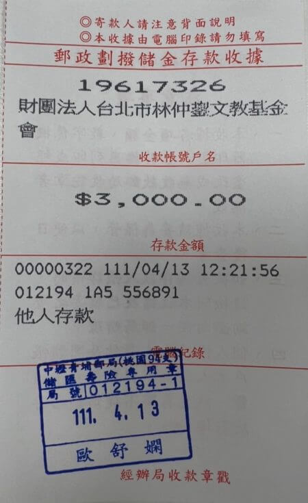 愛心款項$3,000元,已捐給您指定的【社團法人台北市林仲鋆文教基金會】