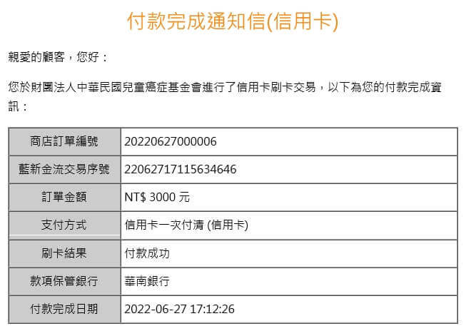 愛心款項$3,000元,已捐給您指定的【財團法人中華民國兒童癌症基金會】