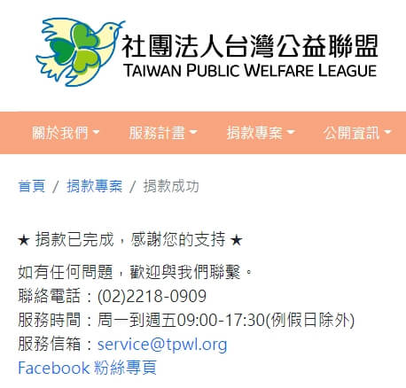 愛心款項$3,000元,已捐給您指定的【社團法人台灣公益聯盟】
