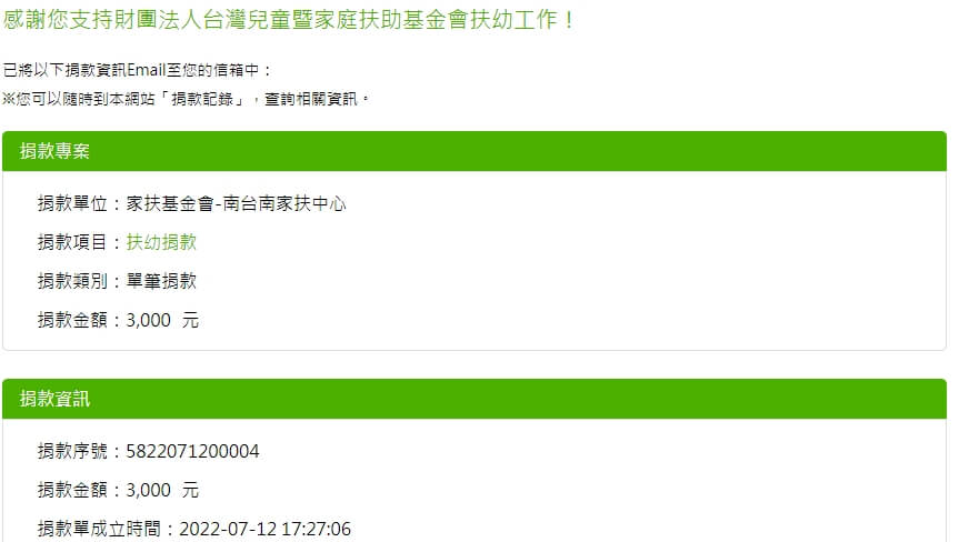 愛心款項$3,000元,已捐給您指定的【財團法人台灣兒童暨家庭扶助基金會】