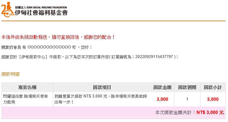 愛心款項$3,000元,已捐給您指定的【財團法人伊甸社會福利基金會】