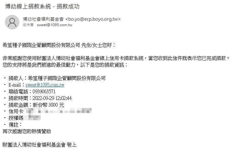 愛心款項$3,000元,已捐給您指定的【財團法人博幼社會福利基金會】