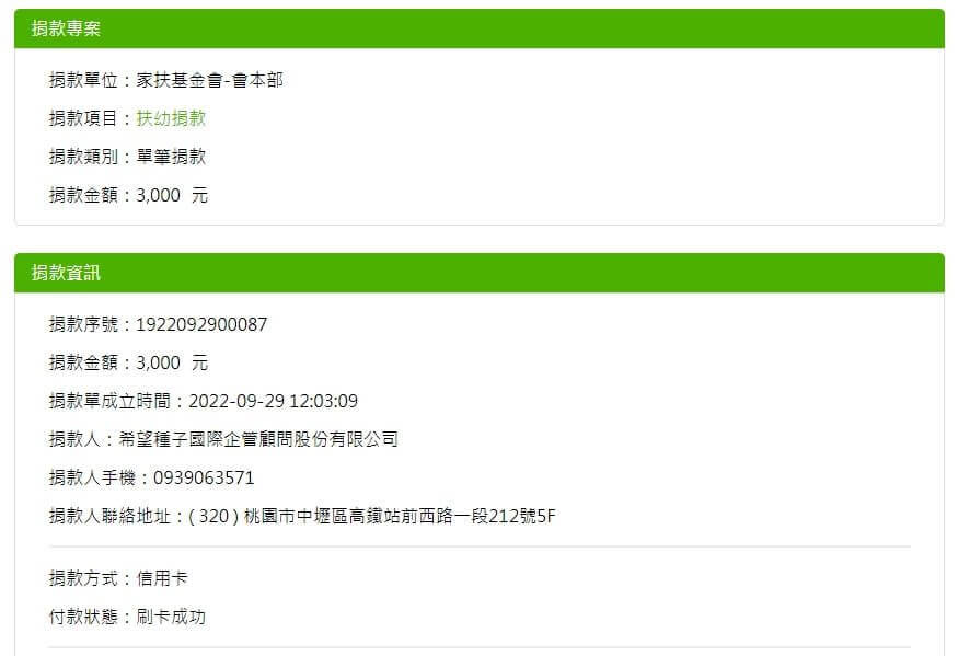 愛心款項$3,000元,已捐給您指定的【財團法人兒童暨家庭扶助基金會】