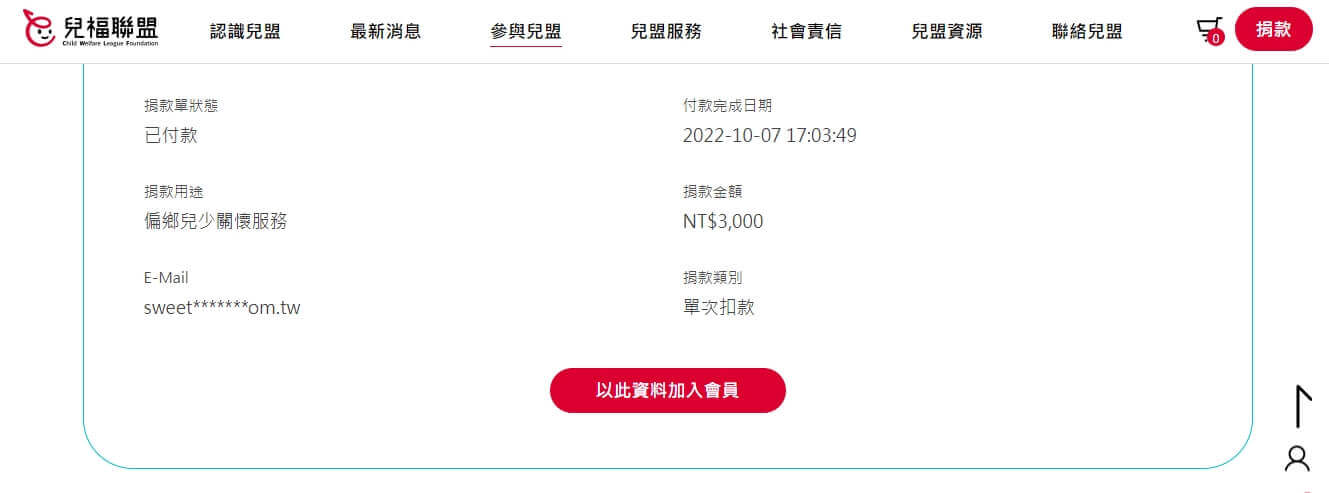 愛心款項$3,000元,已捐給您指定的【財團法人中華民國兒童福利聯盟文教基金會】